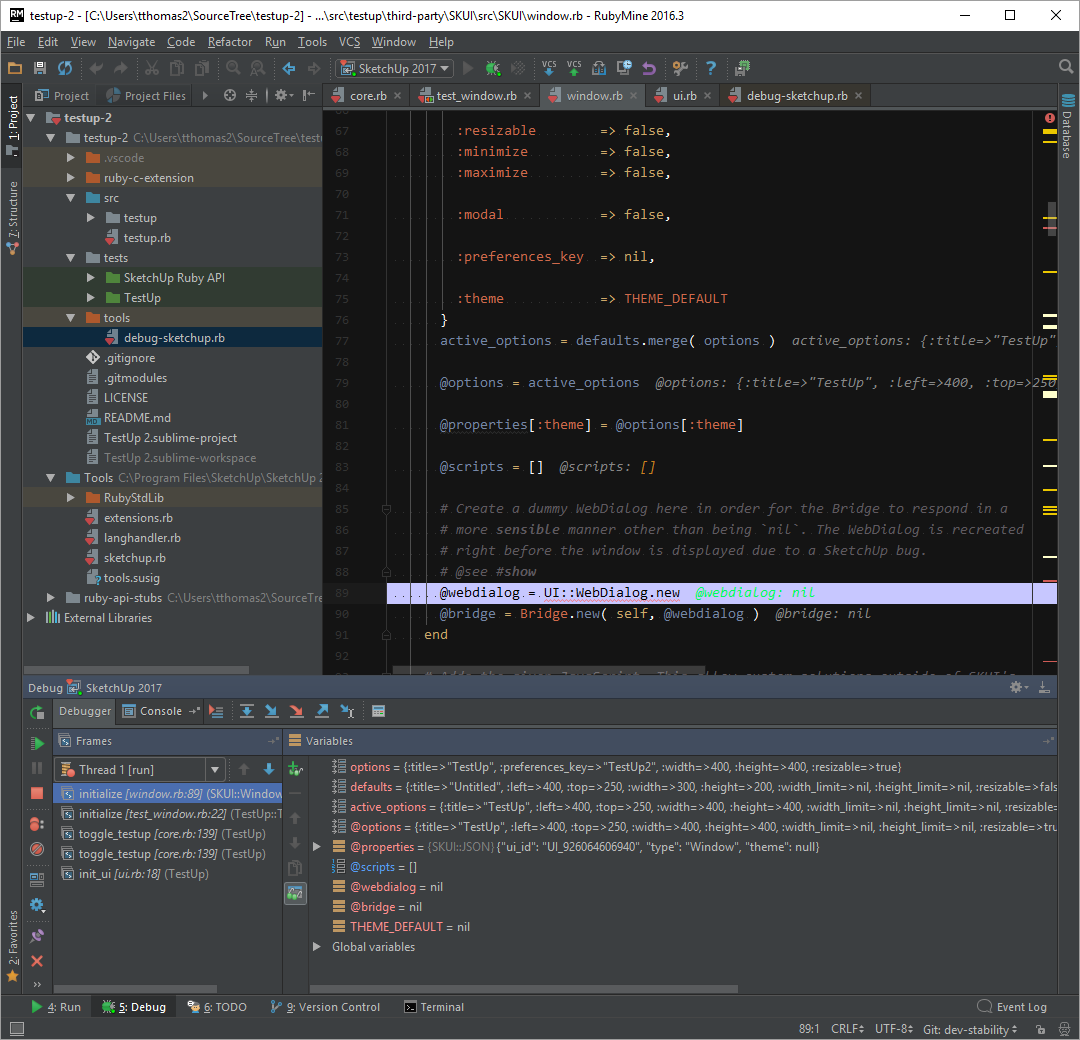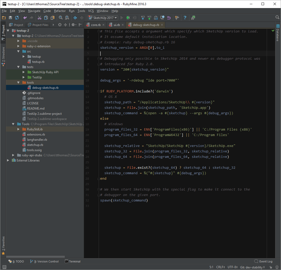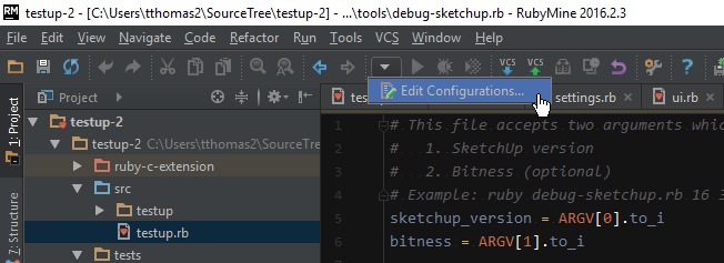Here we configure RubyMine to run debug-sketchup.rb with a parameter that controls which SketchUp version we want to use.