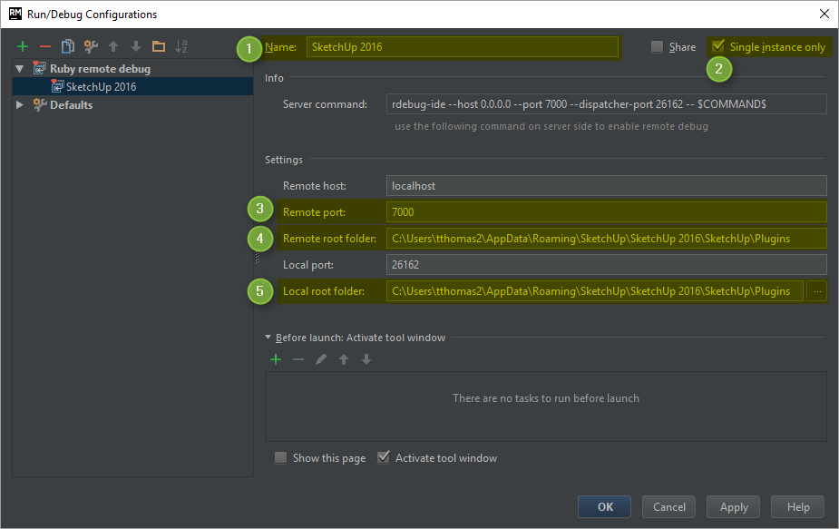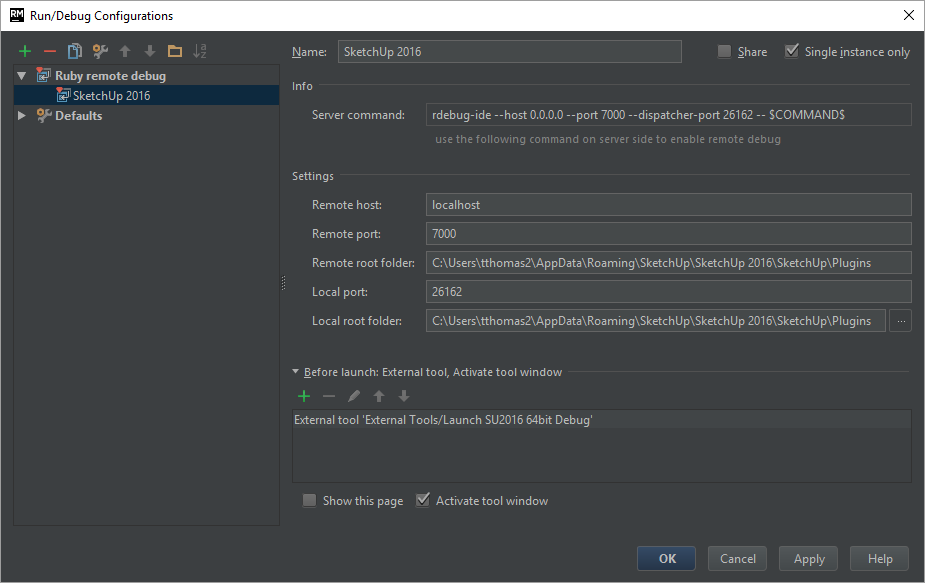 2. RubyMine doesn't know if the SketchUp window have closed or not. So we tick the Single instance only setting in order to ensure that RubyMine stops listening to previous debug runs if you should need to close and restart SketchUp during your debugging session.