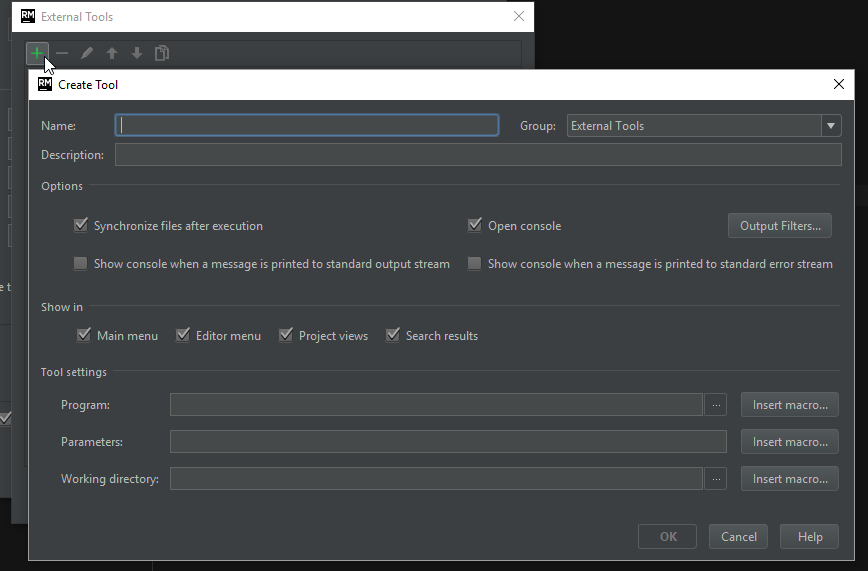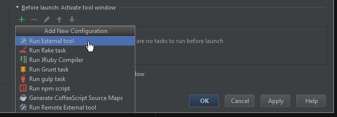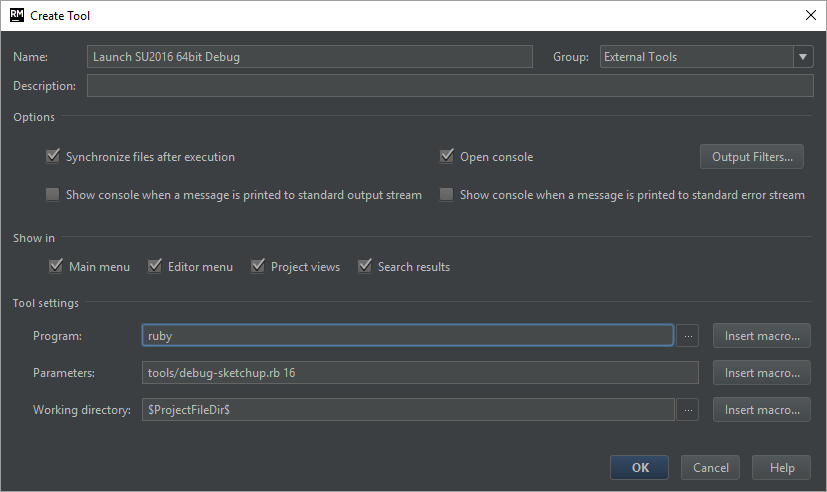 Now we need to set up the debug config to launch SketchUp in debug mode. For that we set up an External Tool that RubyMine will launch when we start the debugging.