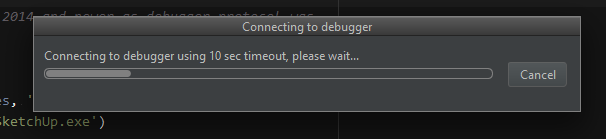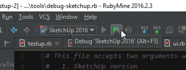 RubyMine will then start listening for SketchUp which is launched at the same time. When SketchUp is launched in debug mode it will appear frozen until a debugger client like RubyMine have connected.