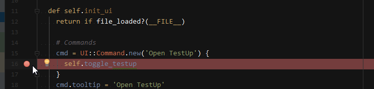 After RubyMine have connected to SketchUp we can start stepping through code. Set breakpoints in the source code by clicking in the left gutter next to the line where you want to break: