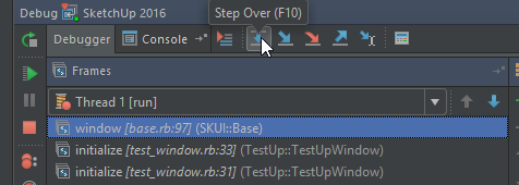 Switch to SketchUp and exercise your extension. When we then trigger the breakpoint SketchUp will halt and you can step through the executing Ruby code using RubyMine.