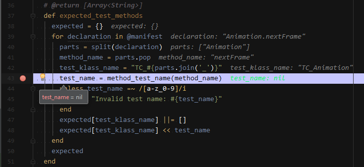 RubyMine will also show inline values for the variables in your source.