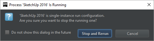 If you close SketchUp you need to launch the debugger again. You will then be prompted with a message saying you already have a session open. This is because RubyMine doesn't know when SketchUp closes. Because we ticked Single instance only earlier it will ask us to stop the existing one. If you didn't check that option earlier you may experience that RubyMine isn't able to connect because the port is already busy.